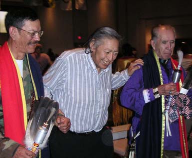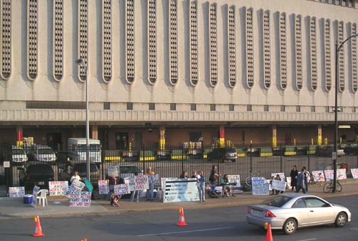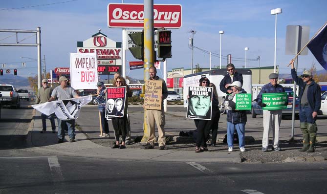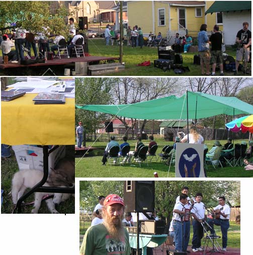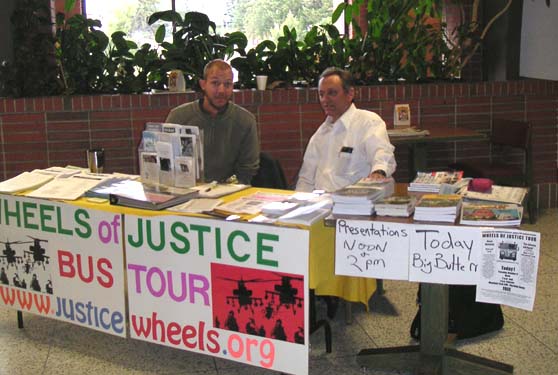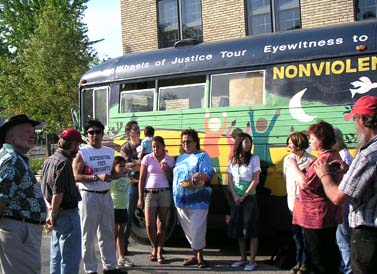 From The SPRING WOJ Tour  Highschool students visit the bus in Tulsa, Oklahoma after we preseted at classes April 15, 2005  Tax Protest April 15 in Tulsa, Oklahoma  Tax Protest April 15 in Tulsa, Oklahoma  Phillips Theological Seminary, 4/14/05  Being Presented with Eagle Feather, Tahlequah, Oklahoma, 4/16/05  At a Powwow in Tahlequah, Oklahoma, Elder Native American supported, 4/16/05  Mazin, Ceylon, and Bill at Fayetteville, Arkansas just after presentation 4/19/05  Picnic, music (hispanic band shown), food, and teach-in at Ft Smith Arkansas