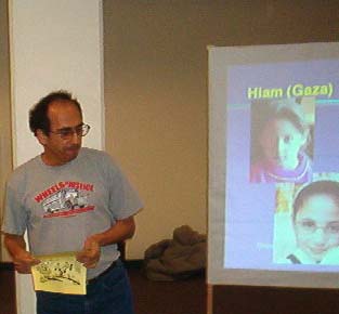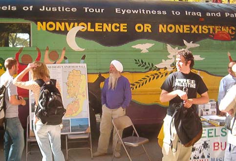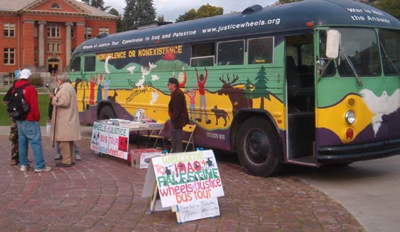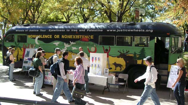 (note: some names and locations not listed, please let me know if you want your name or the location identified on the captions)  Dan Pearson (bus manager) and David Lippman (speaker and entertainer) tabling at Student Union  The Wheels of Justice always parks in prminent locations on campuses  Mazin giving talk  Nargila break. Dan, Brad (bus driver), host, David  Joining Demonstration at busy intersection downtown  Olive wood sold  Bob (bus driver), Dan, and a hispanic family who attended the talk  Dozens of students stoppeed by to check our table on campus  Hosted for Arabic food by two Palestinian women in Salt Lake City   Mahan with bus parked at Student Union in University, Salt Lake City  Welcoming band at Church in Salt Lake City  Kelly and her dog (well behaved bus mascott)  High School Students  High School Students  High School Students  At the Sabeel Conference in Denver, Colorado, Kelly, Dan, Mazin, Bob